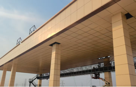 濟(jì)鄒3標(biāo)段任城、太白湖收費(fèi)站天棚,投影面積1157平方米。建筑高度11.9米,5進(jìn)5出共10個(gè)收費(fèi)車道,裝飾裝修2mm、2.5mm鋁單板。