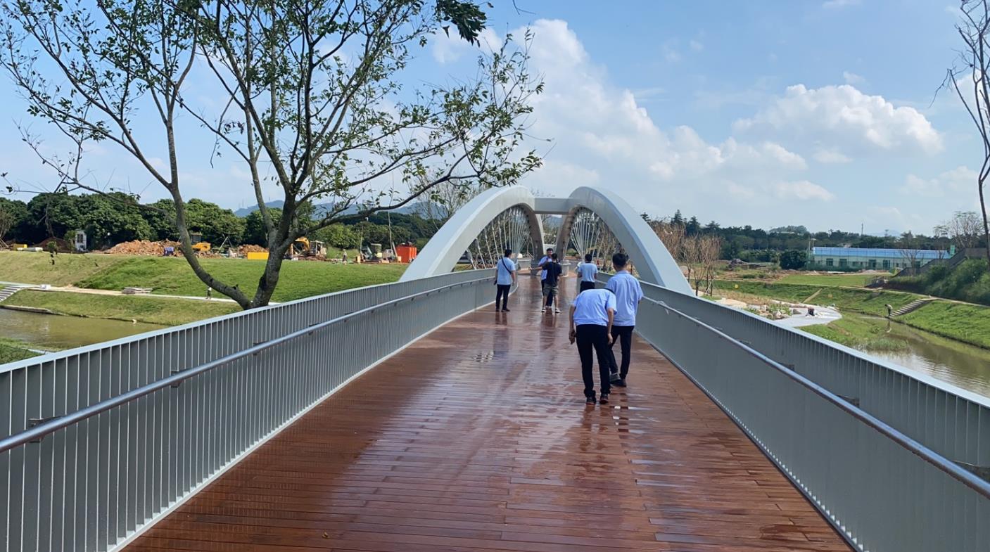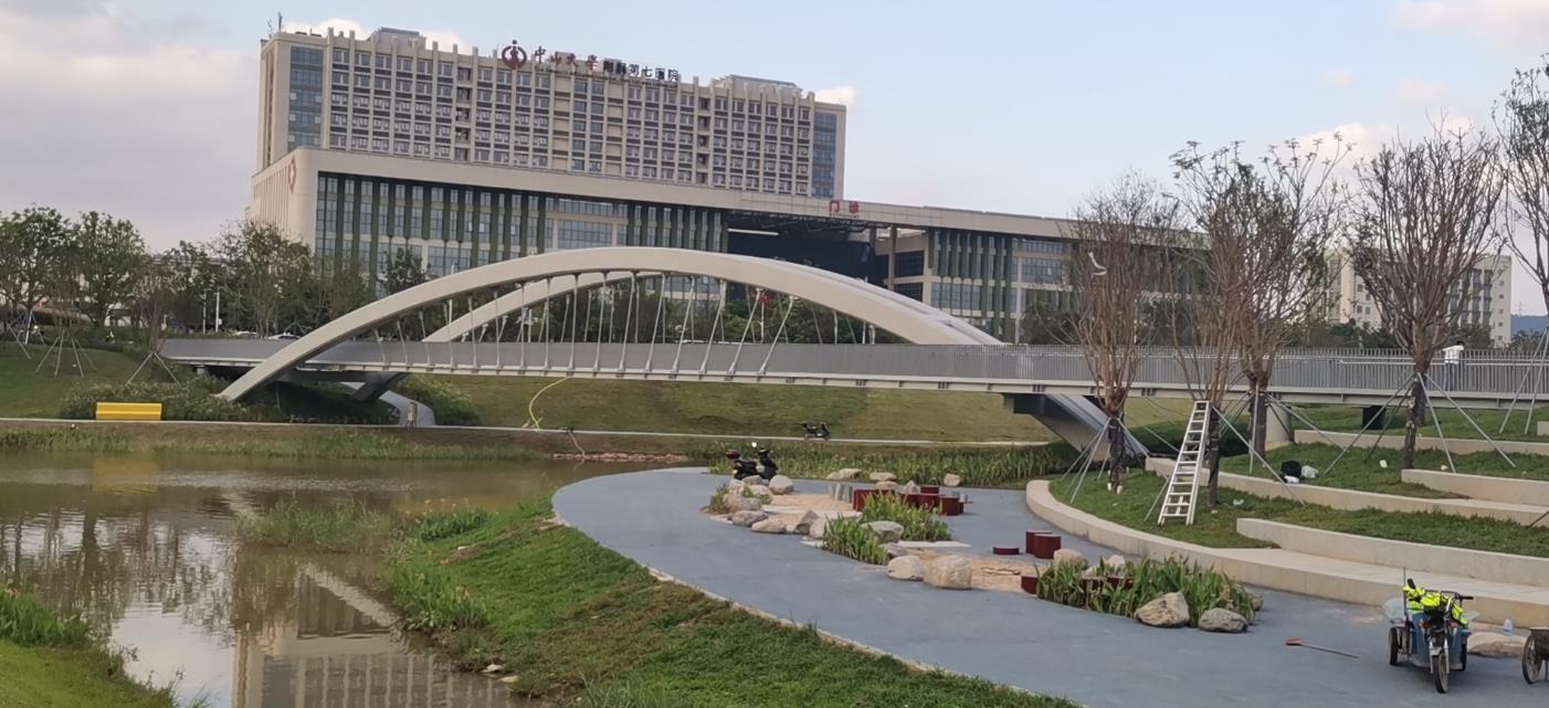 魚之躍拱橋橋梁總長82.858m,橋梁結構為中承式拱橋橋梁跨徑組合為:7.535+9.417+48.960+9.417+7.529m ;拱肋跨徑為:58.462m,橋梁拱軸線采用變化圓弧軸線,半徑為77.545m及 47.173m  ; 拱橋矢跨比:1:7.07,橋梁橋面系采用鋼桁架橋面系,下部采用1.2m樁基礎+拱座承臺,橋臺采用重力臺。