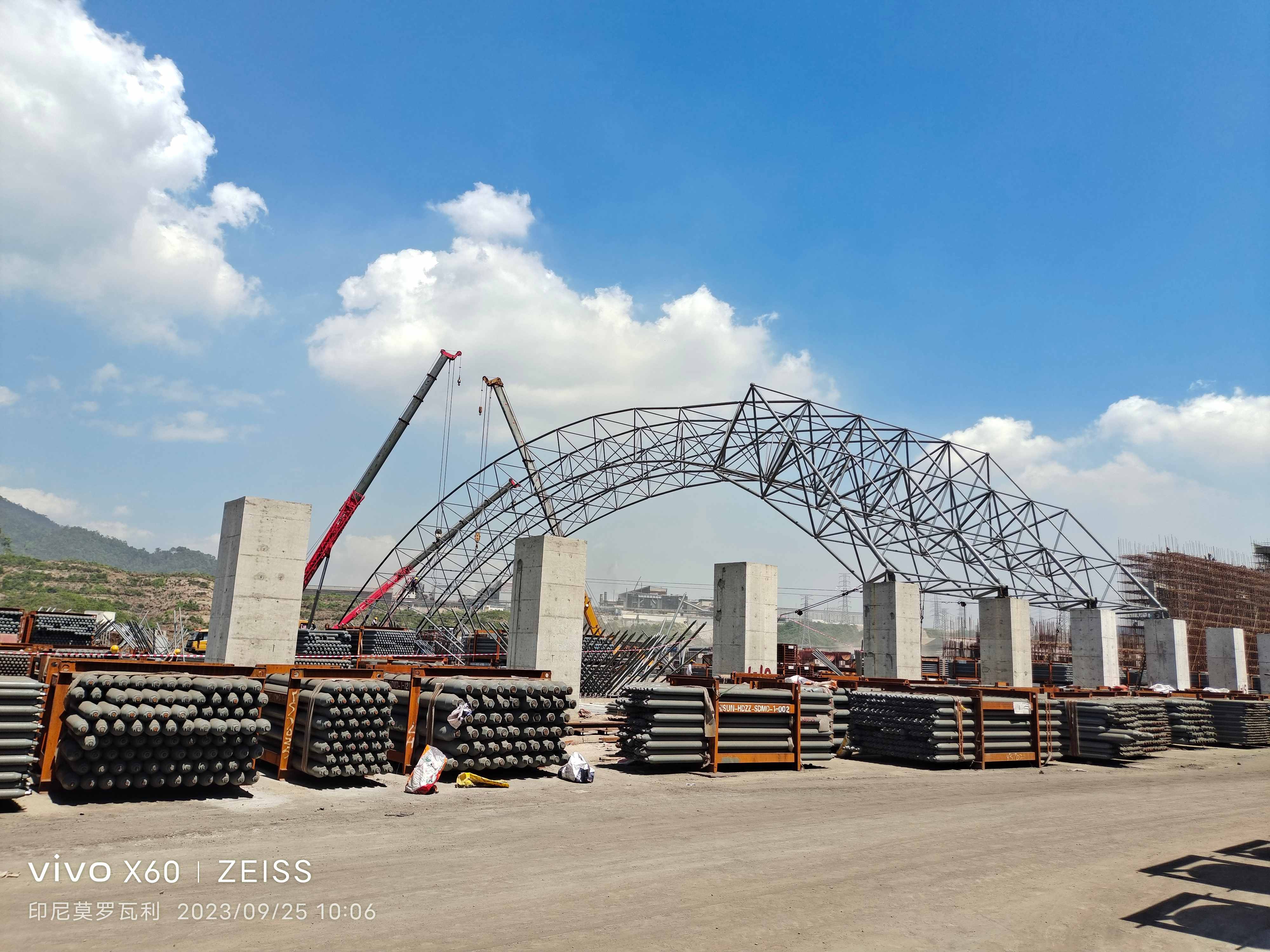 項目位于印度尼西亞跨赤道南北兩側,屬于熱帶雨林氣候,終年受赤道低壓帶控制,盛行上升氣流,終年高溫多雨,主要降水類型為對流雨,年平均溫度27℃左右。料場東西跨105米(焦棚)、125米(煤棚)。本料棚為雙聯跨結構型式,中間設鋼排水溝。下部支撐為獨立砼柱,邊柱高2.0米,中柱高5.0米。
