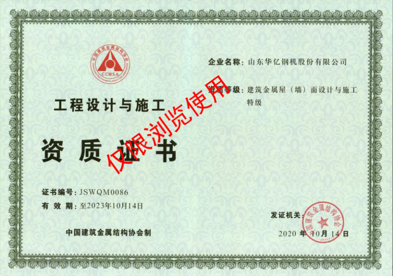 我公司自成立以來(lái),以為社會(huì)和客戶(hù)創(chuàng)造價(jià)值為己任,勇于創(chuàng)新,不斷進(jìn)取,勇攀行業(yè)高峰。近日成功通過(guò)中國(guó)建筑金屬結(jié)構(gòu)協(xié)會(huì)及分會(huì)幾位鋼結(jié)構(gòu)專(zhuān)家的嚴(yán)謹(jǐn)評(píng)審,建筑金屬屋(墻)面設(shè)計(jì)與施工特級(jí)資質(zhì)證書(shū)已順利頒發(fā)!