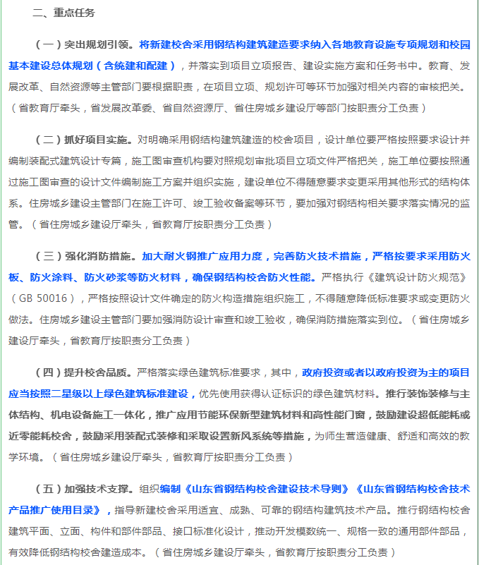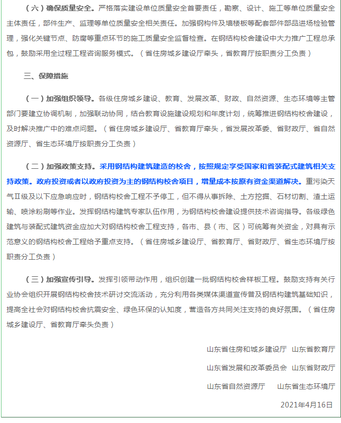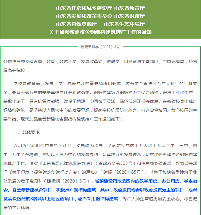 山東省住建廳等六部門關于加強新建校舍鋼結構建筑推廣工作的通知