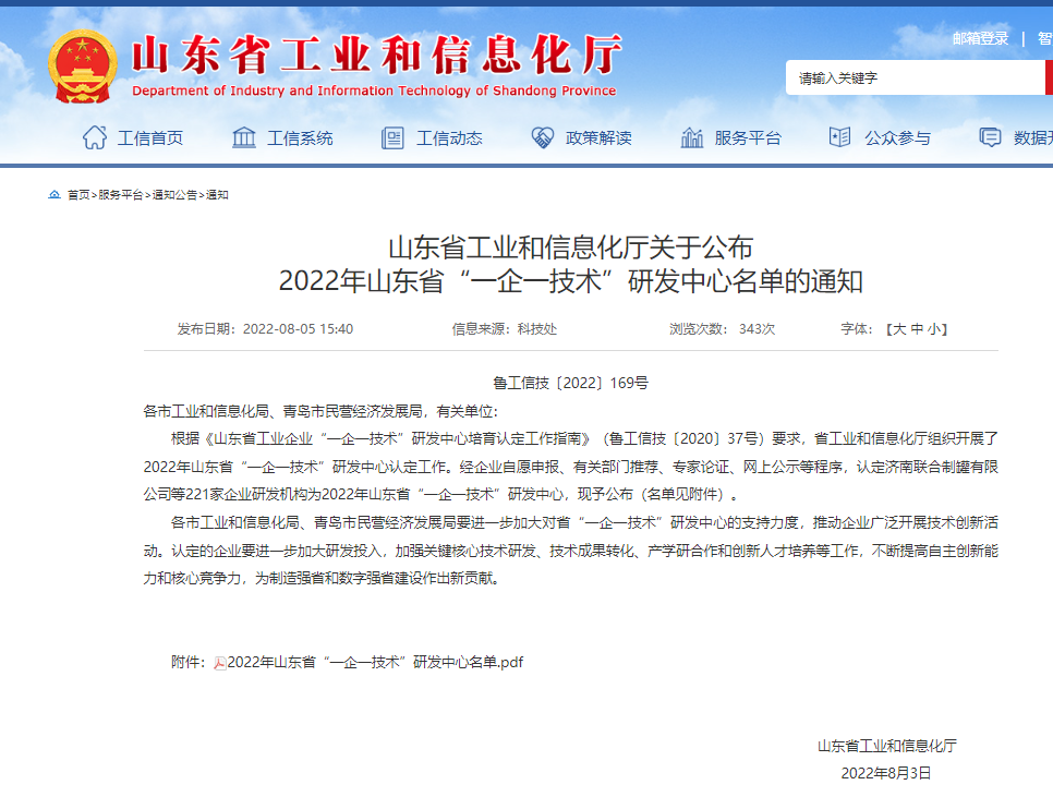 近日,省工信廳公布2022年山東省“一企一技術”研發中心名單,公司成功獲批,是曲阜市第8家省級“一企一技術”研發中心,同時也是本年度曲阜市唯一一家成功獲批該稱號企業。