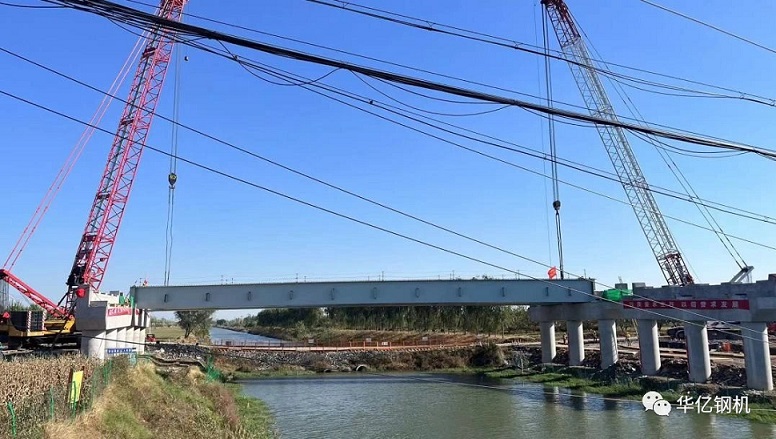 跨羊山運河橋跨度55米,總重量約850噸,由6道縱梁組成,組裝完成后縱梁最大吊裝重量為137噸,拼裝現場配備一部350噸履帶吊卸車、拼裝,55m組合梁橋位兩端各配備一部350噸履帶吊將縱梁吊裝就位。