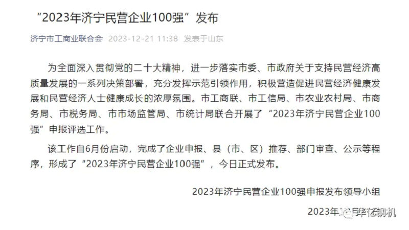據了解,為全面深入貫徹黨的二十大精神,進一步落實濟寧市委、市政府關于支持民營經濟高質量發展的一系列決策部署,充分發揮示范引領作用,積極營造促進民營經濟健康發展和民營經濟人士健康成長的濃厚氛圍,濟寧市工商聯、市工信局、市農業農村局、市商務局、市稅務局、市市場監管局、市統計局聯合開展了“2023年濟寧民營企業100強”申報評選工作。該活動自6月份啟動,完成了企業申報、縣(市、區)推薦、部門審查、公示等程序,形成了“2023年濟寧民營企業100強”,于12月21日正式發布。