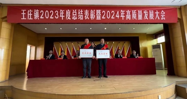 2月22日上午,王莊鎮召開2023年度總結表彰暨2024年高質量發展動員大會,全面總結2023年工作成效,部署2024年重點工作。大會對在2023年度工作中作出突出成績的先進單位和個人予以表彰,公司分別榮獲“龍頭企業”、“助力王莊爭先進位企業”、“最具社會責任感企業”、“群團工作先進單位”;董事長張猛榮獲“優秀企業家”稱號,并作為企業家代表發言。