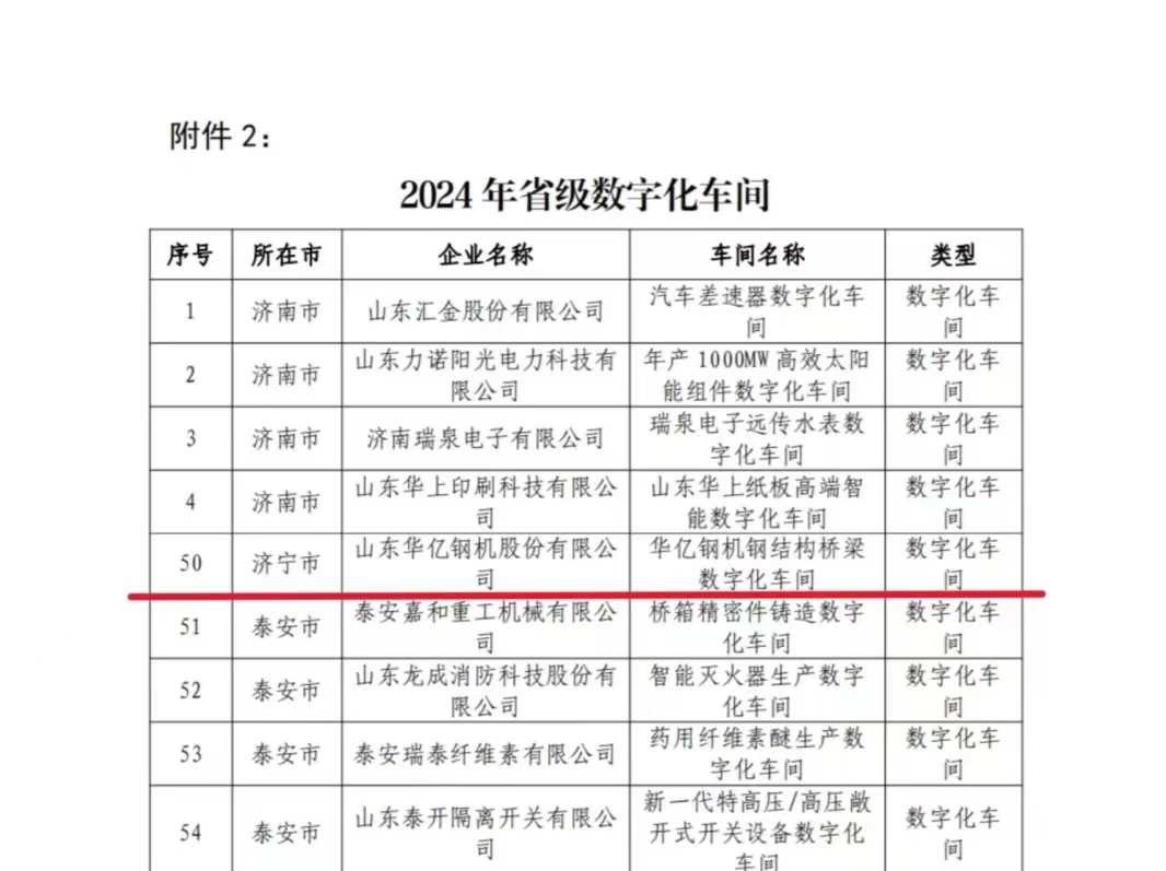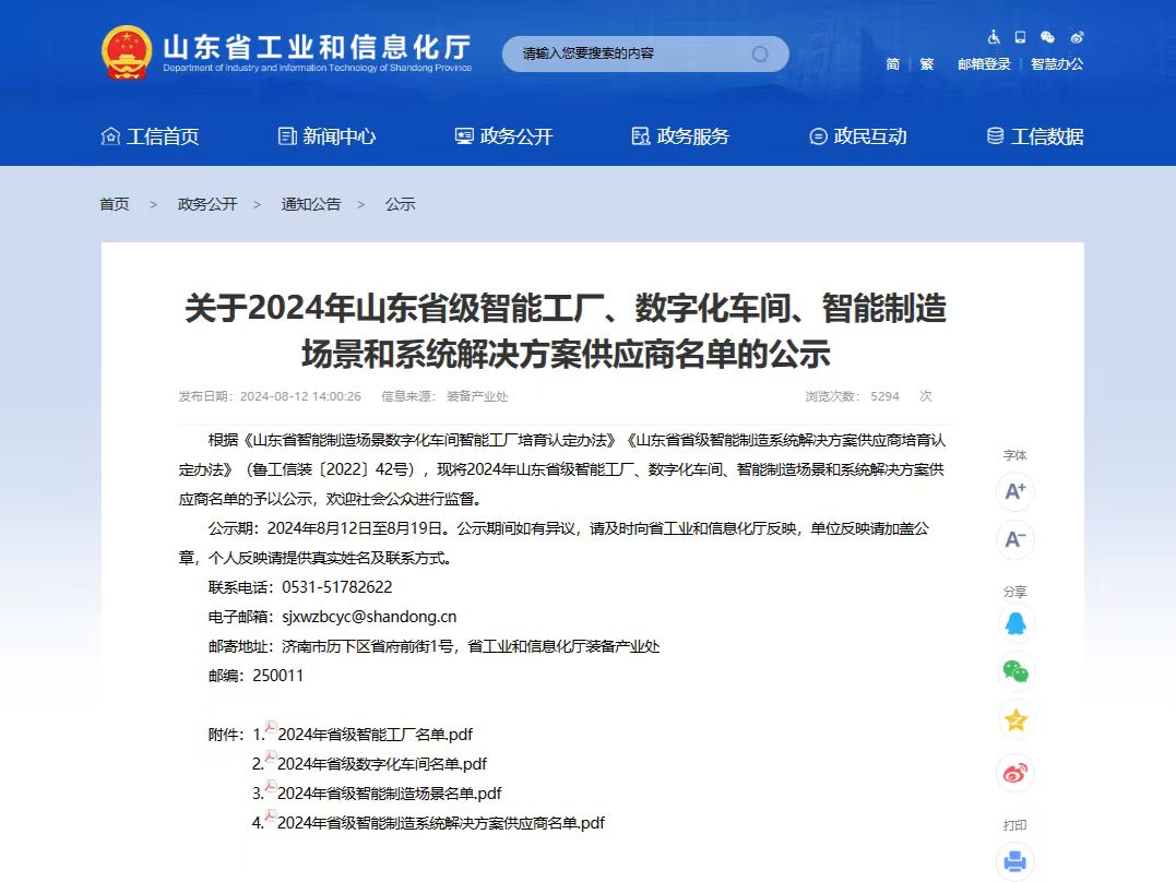 8月12日,山東省工業和信息化廳公示了2024年山東省級智能工廠、數字化車間、智能制造場景和系統解決方案供應商名單,公司成功入選2024年省級數字化車間名單和省級智能制造場景名單。