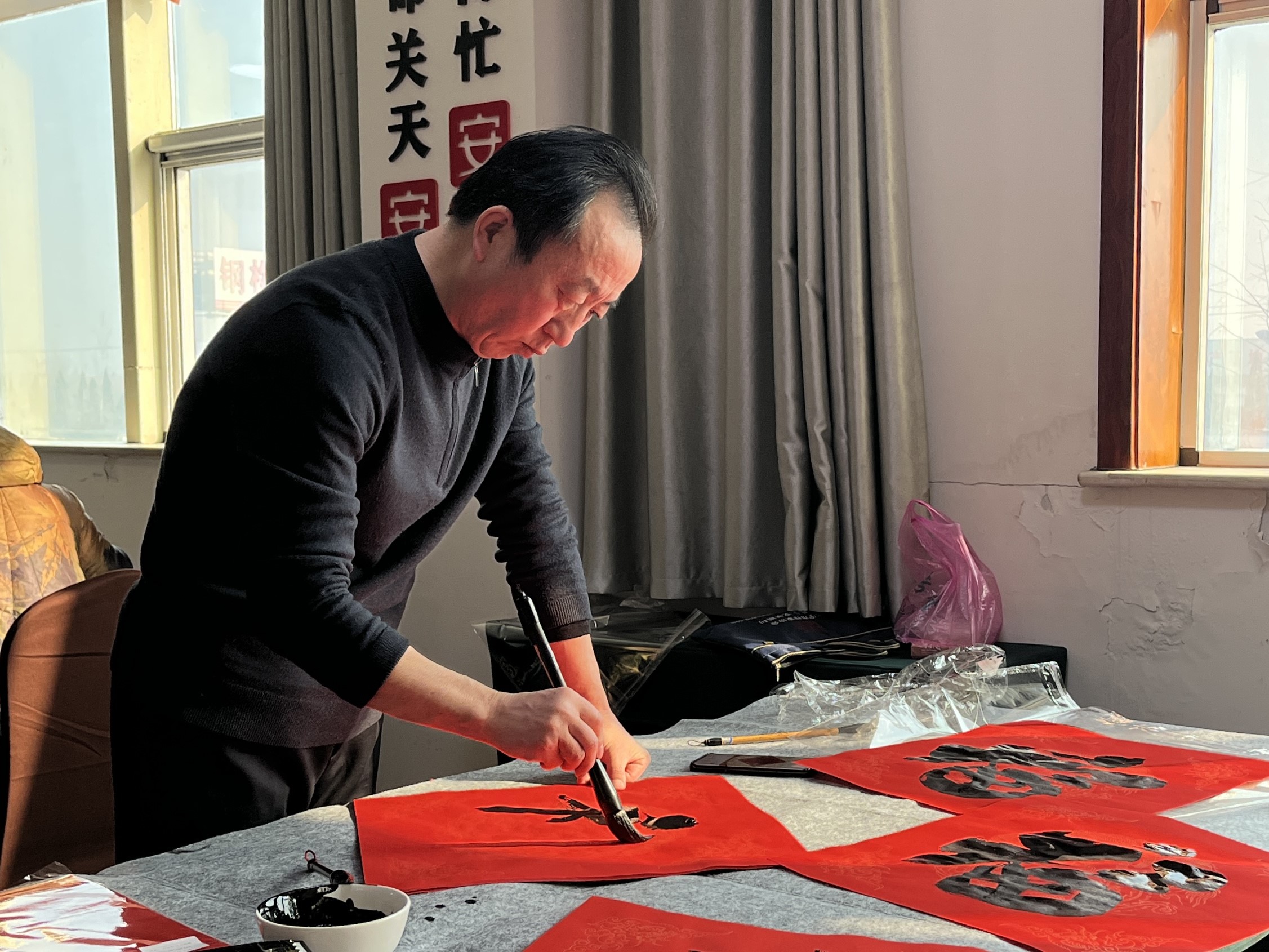 活動現場,書法家們熱情滿滿地揮筆書寫福字,筆走龍蛇,墨舞飛揚,一筆一劃盡顯漢字風韻、一張一弛共書暖心祝福,一行行俊逸的書法、一句句祝福的話語、一張張寓意吉祥的“福”字躍然紙上。這些作品不僅展現了藝術家們的精湛技藝,更傳遞了對公司員工的美好祝愿。