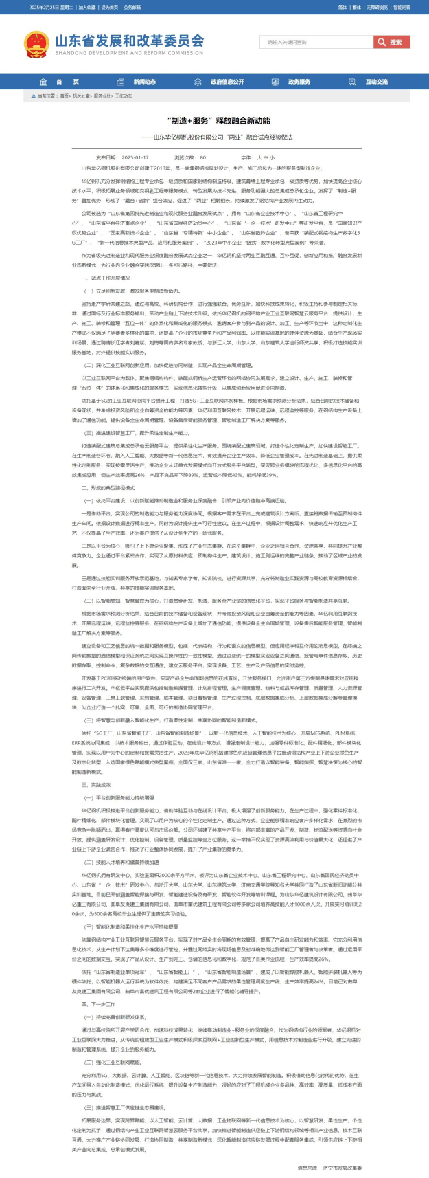 近日,公司作為省級先進制造業和現代服務業深度融合發展試點企業的典型代表,“兩業”融合試點經驗做法受到了山東省發展和改革委員會的關注,并進行了專題報道。