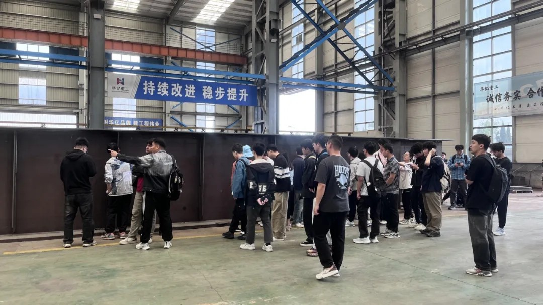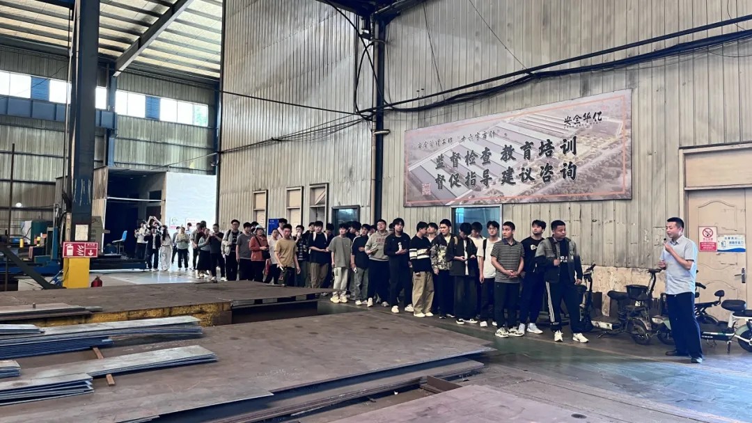 調研首站,研學團深入公司車間生產一線,先后參觀了數控下料車間、自動化焊接車間及裝配式鋼結構加工中心,研學團師生近距離觀察了鋼結構產品的全流程生產工藝。工作人員結合車間實際,為師生們詳細講解了公司在智能制造、綠色生產等方面的技術突破,并分享了公司如何通過技術創新提升產品質量、降低能耗的經驗。