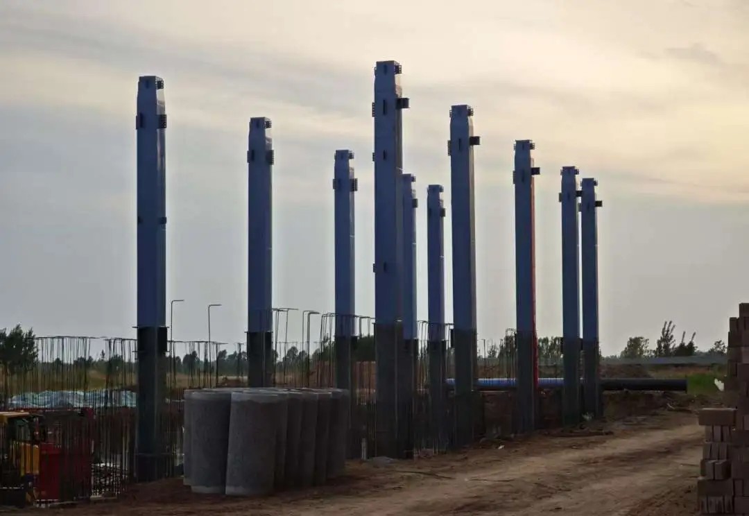 公司董事長張猛,各部門負責人及項目施工、監理單位代表共同出席。在全體人員的見證下,首根鋼柱經專業人員校準后,由吊車精準吊裝至預定位置。