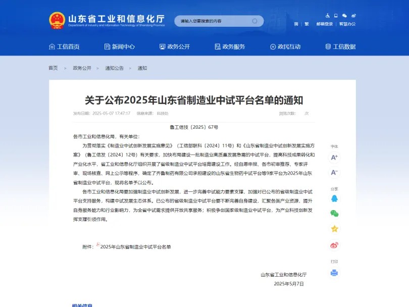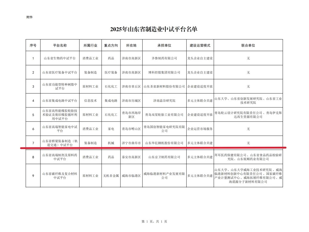 近日,山東省工業(yè)和信息化廳正式發(fā)布《關(guān)于公布2025年山東省制造業(yè)中試平臺名單的通知》,公司憑借“山東省橋梁裝備制造(軌道交通)中試平臺”,成功入選,成為濟寧市唯一獲此殊榮的企業(yè)。這是公司在高端裝備制造領(lǐng)域持續(xù)深耕的又一重要里程碑,標(biāo)志著公司在推動行業(yè)技術(shù)研發(fā)與產(chǎn)業(yè)化協(xié)同發(fā)展方面邁上新臺階。