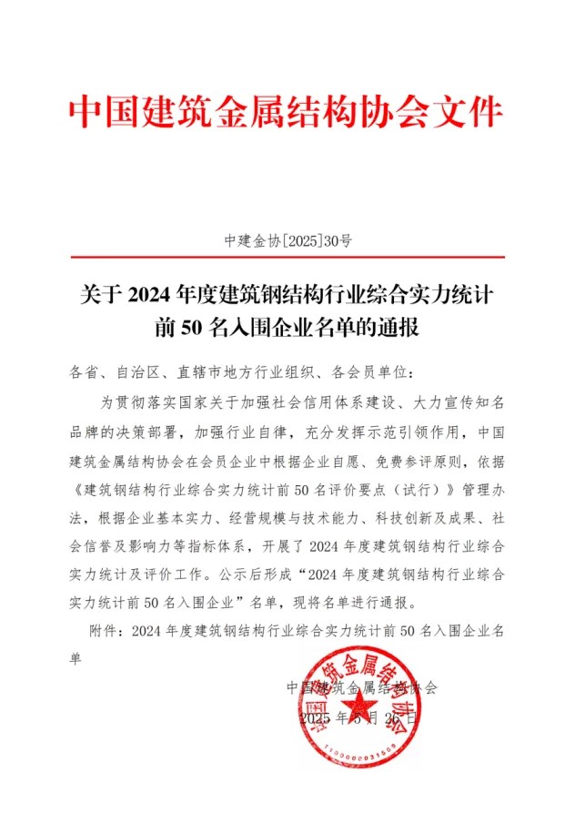 近日,中國建筑金屬結(jié)構(gòu)協(xié)會正式發(fā)布“2024年度建筑鋼結(jié)構(gòu)行業(yè)綜合實(shí)力統(tǒng)計前50名入圍企業(yè)名單”,公司憑借卓越的綜合實(shí)力、優(yōu)質(zhì)的工程質(zhì)量和良好的行業(yè)口碑,再次榮耀登榜,連續(xù)多年蟬聯(lián)此項(xiàng)榮譽(yù),彰顯了公司的行業(yè)地位和品牌影響力。