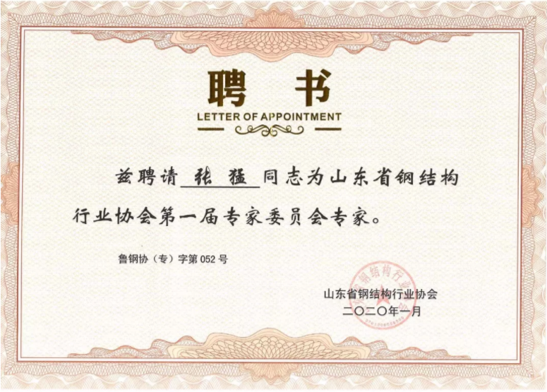 11日晚,山東省鋼結(jié)構(gòu)行業(yè)協(xié)會第一屆專家委員會成立大會召開,會上,公司董事長張猛、總工原豐亭被聘為山東省鋼結(jié)構(gòu)行業(yè)協(xié)會第一屆專家委員會專家。