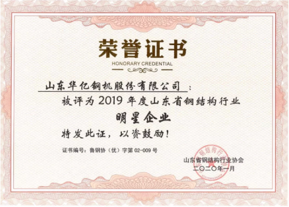 華億鋼機獲得2019年度山東鋼結(jié)構(gòu)行業(yè)明星企業(yè)獎。